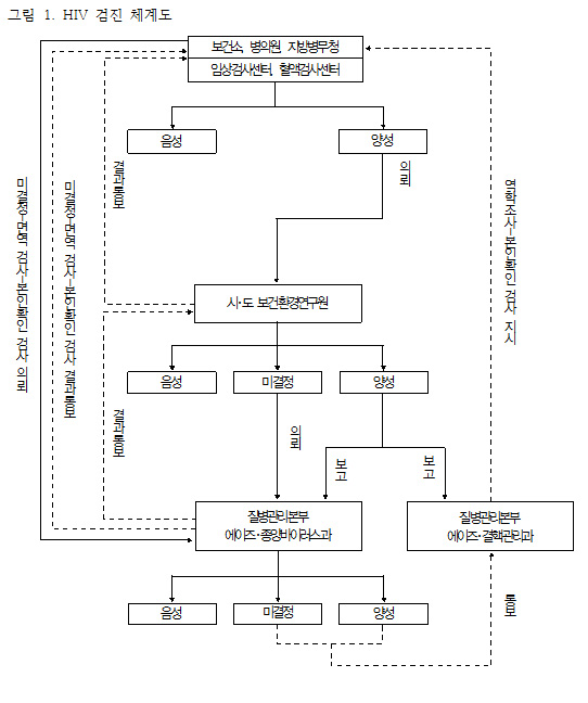 HIV검사는 1차 선별검사(ELISA법, EIA법, immune chromatography법 등)와 2차 확진검사(western blot법)를 통하여 확진되며, 1차 검사기관으로는(보건소, 병․의원, 임상센터, 혈액원 및 검진상담소)등이 있다.