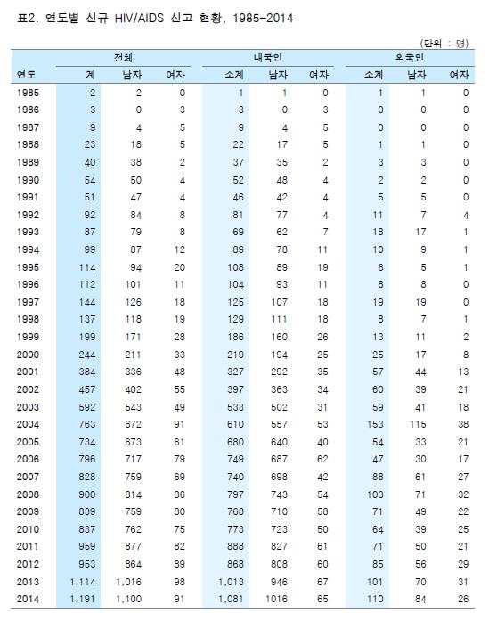 - 2014년 현재 HIV/AIDS 내국인은 9,615명으로, 성별로는 남자 92.4%(8,885명), 여자 7.6%(730명)임