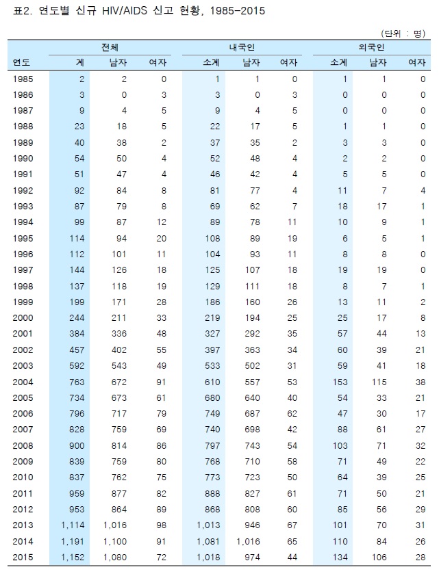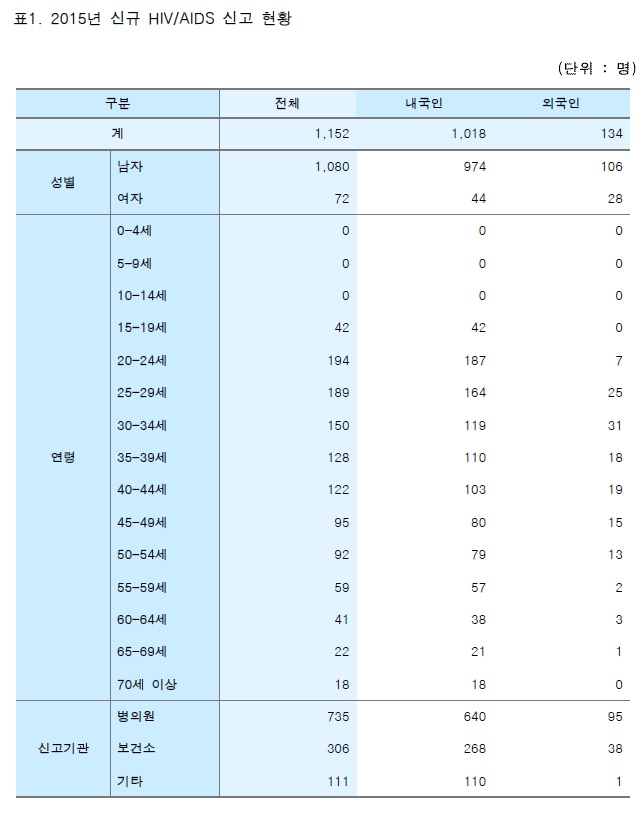 - 2015년 한 해 1,152명이 신규로 신고 되었으며, 내국인은 1,018명, 외국인은 134명임
