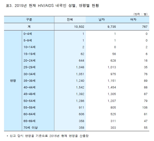 - 2015년 현재 HIV/AIDS 내국인은 10,502명으로, 성별로는 남자 92.7%(9,735명), 여자 7.3%(767명)임