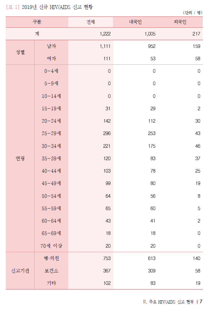 ○ 2019년 한해 1,222명의 HIV 감염인이 신규로 보고되었으며, 이 중 내국인은 1,005명(82.2%), 외국인은 217명(17.8%)이었다.