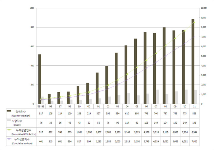2011년 12월말 기준 내국인 신규 감염인은 888명이며, 누적 감염인수는 8,544명임. 이중 1,512명이 사망하여 7,032명의 감염인이 생존하고 있음.
